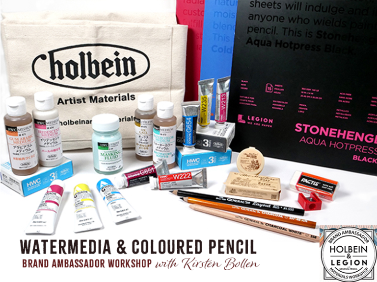 This Watermedia & Coloured Pencil Workshop will focus on Holbein Watercolour, Gouache, Acrylic Gouache, and Watercolour Mediums, as well as Holbein Coloured Pencils and MELTZ products. You will also use Legion’s 100% cotton Stonehenge Aqua White and Black papers, Yupo White paper, and an assortment of General Pencil materials.